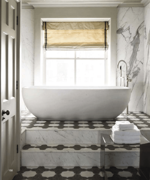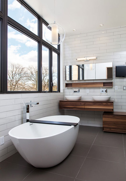 In the principal en suite, the egg-shaped tub can stay, but I wonder if there’s a more creative way to treat the walls and floor than played-out subway tiles and blah squares?