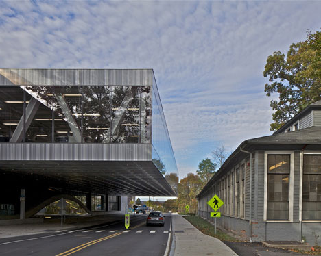 Last week, on my way down to New York City, I stopped at Cornell University to see their new Architecture, Art and Planning building, Milstein Hall. The OMA-designed facility looks like a Mies van der Rohe-style box propped up on a concrete ant hill, floating not incongruously between the kind of Victorian and Georgian structures one imagines at an Ivy League school. Some of the design is quite subtle — part of the exterior is clad in elegantly stripped Turkish marble — while some of it is showy and loud — a giant, 50-foot cantilever reaches over University Ave., almost-but-not-quite touching the 150-year-old Foundry Building across the road. I wasn’t sure if this latter gesture was an act of aggression — like a bully announcing its presence to a meek, helpless victim — or one of kindness, like an outstretched hand between a young spunky kid and an old, fair lady. This ambivalence basically describes my reaction.