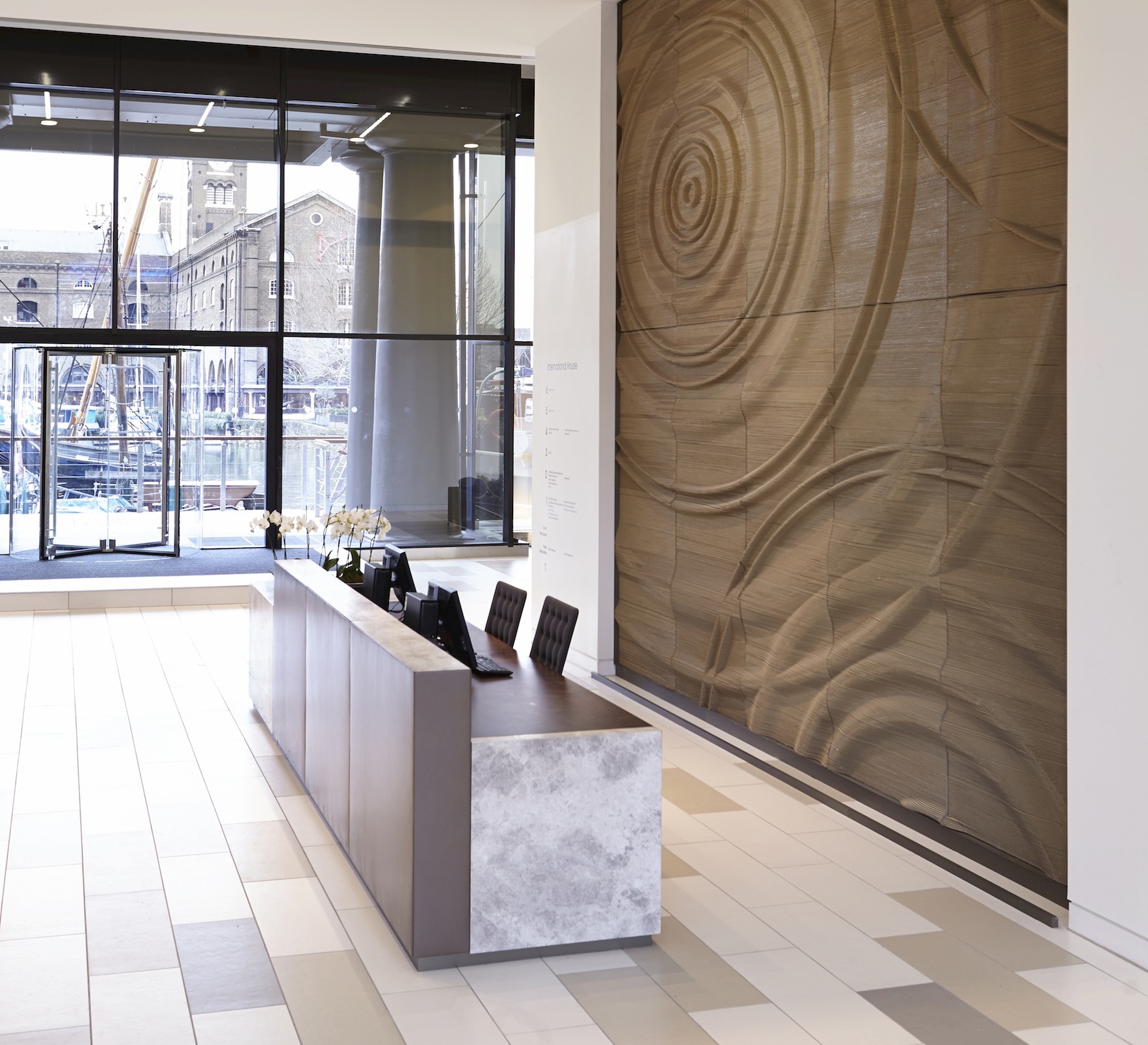 Cardboard’s soft-yet-rough, organic texture stands out in the slick, hard-edged lobby of International House, a high-end London office building. British designer Giles Miller sculpted the corrugation to give it a flowing, liquid look. gilesmiller.com.