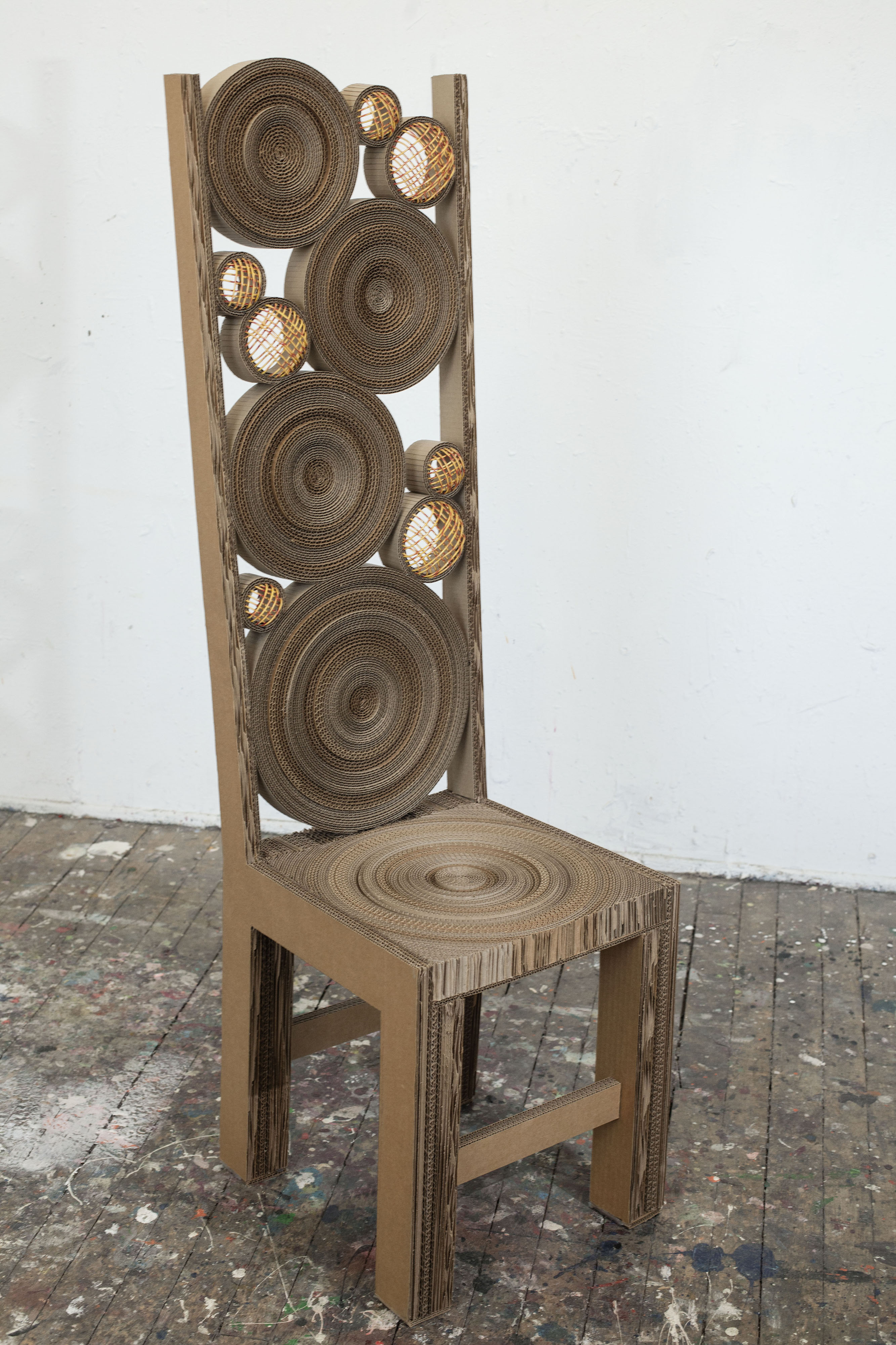 By cutting, layering and gluing together strips of cardboard, Pas à Papier’s Marie-José Gustave shows off the material’s versatile texture. Her Chaise Entre Ciel et t’R has a beguiling grain similar to an exotic hardwood. The chair’s light look belies cardboard’s inherent strength. Through mariejosegustave.ultra-book.org.