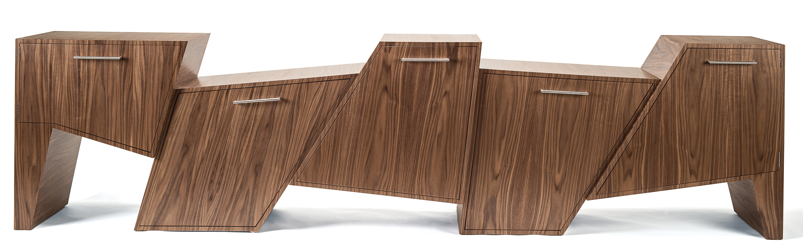 Post high school, Vancouver designer Peter Pierobon knew his future was in furniture (having had an epiphany while flipping through a tome of chairs and tables), but didn’t know where to learn the trade. Instead of simply signing up at a local community college, he bought a VW Westphalian (it was the early seventies) and travelled North America for 10 months looking for the perfect mentor. He found it in Wendell Castle, a renowned master craftsman equally well-versed in the artistic and engineering sides of design. Forty odd year’s later, Pierobon’s walnut side bar proves that he both learned his lessons well and continues to push himself. The form was inspired by to the beauty of the Rocky Mountains and is hand-constructed with laser-like precision – necessary when building with such complex geometries and colliding, slanted shapes. 36″ h x 15′ w x 28″ d. $19,500. Through peterpierobon.com.