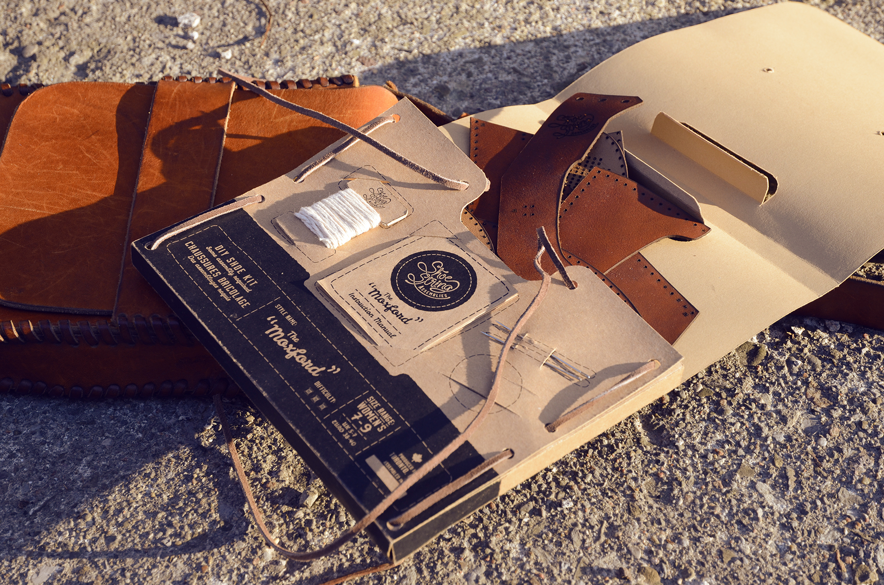 Called Shoe String Assemblies, Elershaw’s idea is simple. People will be able to purchase one of her kits online (likely through Etsy, at an estimated price of $80 to $100). Each pack contains a needle and thread, a rubber sole, a pair of laces, a set of instructions and a handful of leather bits. The hide (all vegetable tanned to avoid toxins) is prepunched to make stitching easier. Unlike most shoemaking, there’s no glue involved (not even in the shipping packs, which are held together with the laces), and the design doesn’t require a last, the form required to mould most footwear.